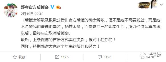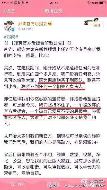 昨晚,郑爽官方后援团宣布解散,粉丝群高层陆续撤职,后援会解释最近没有提供任何官方消息行程,是因为联系不到团队、小爽以及相关负责人,现在他们实在坚持不住了。