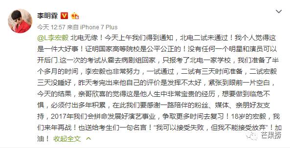 同样是今年参加艺考的李宏毅,被哥哥发布微博证实今年也与北电无缘。