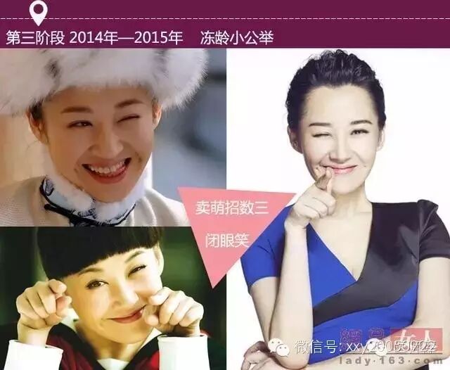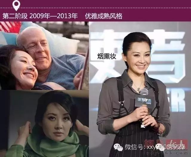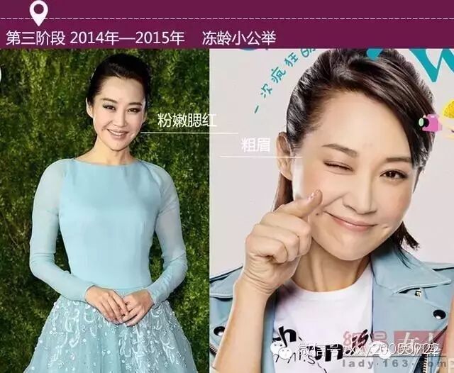 大概在90年代后期开始突出眼睛,流行浓重的眼妆。抹了腻子一样煞白毫无血色的底妆,铺满眼皮的橘红色配上鲜红的唇妆然更年轻的许晴一下老了10岁。不过自然不做作的眉形却隐约透露出许晴清纯的本色。
