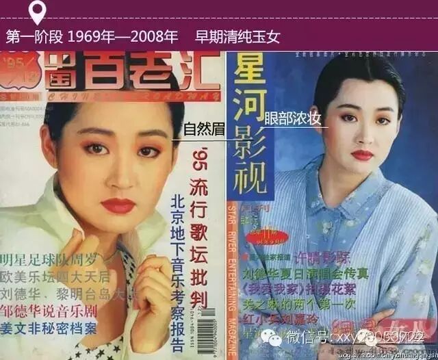 2000年初的时候受到香港潮流的影响,细细的柳叶眉和拱形眉开始流行,同时砖红色甚至棕色的唇妆也慢慢出现在女明星妆容上,不知道这算不算是早期的姨妈色唇色。