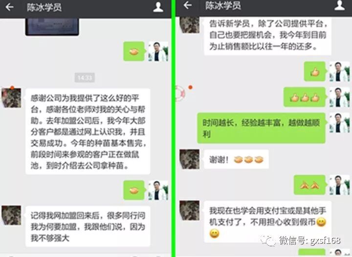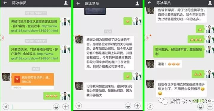 加盟金诚双丰一年后陈冰原话:“感谢金诚双丰为我提供了这么好的平台,感谢各位老师对我的关心与帮助。去年加盟公司后,我今年大部分客户都是通过网上认识我,并且交易成功。今年的竹鼠种苗基本售完,前段时间来参观的客户正在做鼠池,到时介绍去公司拿种苗。”