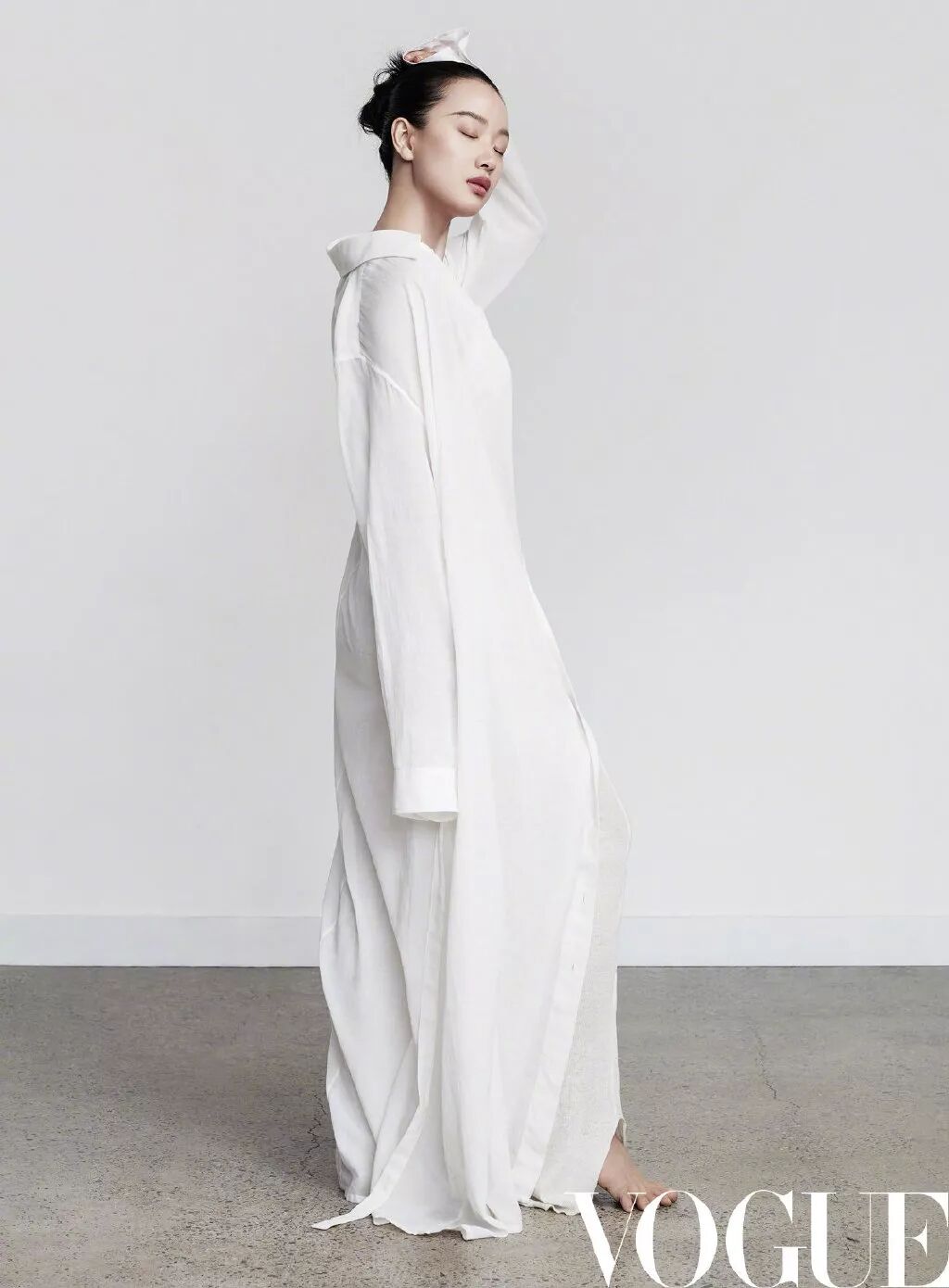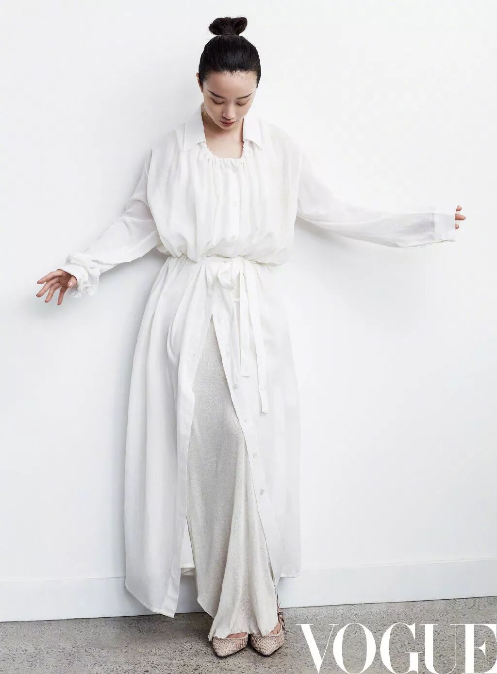 白色长裙、白色长外套均为Ann Demeulemeester