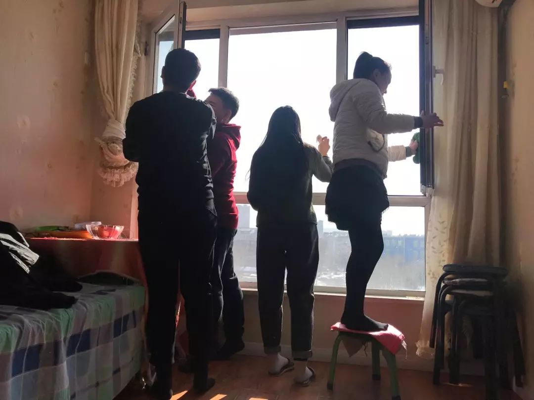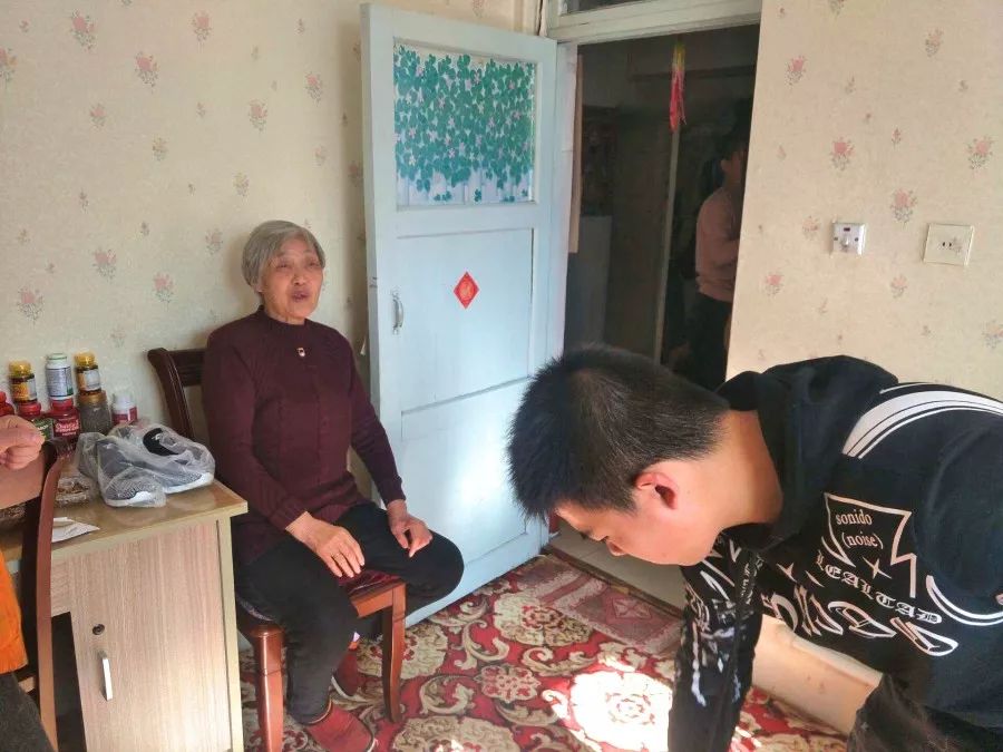 其中杨钰基、杨绪卓、姜志颖和社区书记为老人擦玻璃;