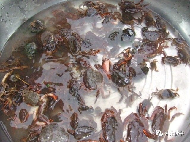 天刚刚亮就开始上路,在岸边放下自行车,光着脚丫子,穿着背心裤衩,踩着满地的冰冻碴子,往前继续再走大约十里路,到了地头,天刚微明,螃蟹窝被退潮水带的沙子埋起来,水落溜刚好显出痕迹,一个个好像是驴蹄印。伸手张开五指,抓下去,捉住螃蟹的盖,顺手放在拖袋里。螃蟹夹住手是常有的事,要是让螃蟹夹住了手,千万不要动它,动物和人一样都有自卫的本能,越往下拽它,它就夹的越紧,夹破皮、夹块肉也不松开它的夹,遇到这种情况,应该把螃蟹连同被夹的手慢慢放在水里,不要动,一会儿,它觉得没有危险了,就会自己慢慢松开夹跑开。
