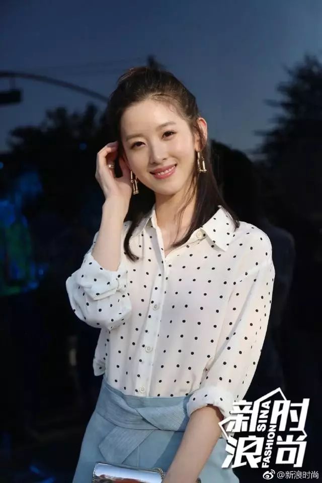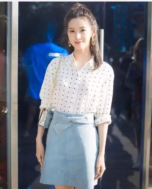 波点白衬衫搭配浅蓝短裙,扎着丸子头,少女感和优雅气质并存。
