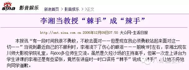 李湘在四川师范大学影视学院礼堂举办的《论电视主持人的综合素质》讲座中把“棘手”说成了“辣手”