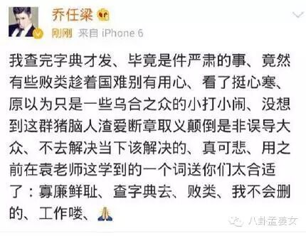 网友指出其用词不当后,乔任梁恼羞成怒又发了一条微博说网友是“寡廉鲜耻的败类”