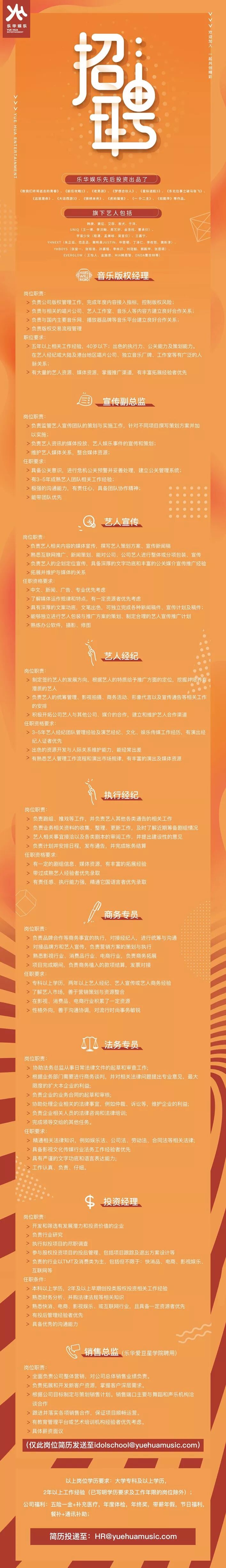 【招聘岗位】:音乐版权经理、宣传副总监、艺人宣传、艺人经纪、执行经纪、商务专员、法务专员、投资经理、销售总监