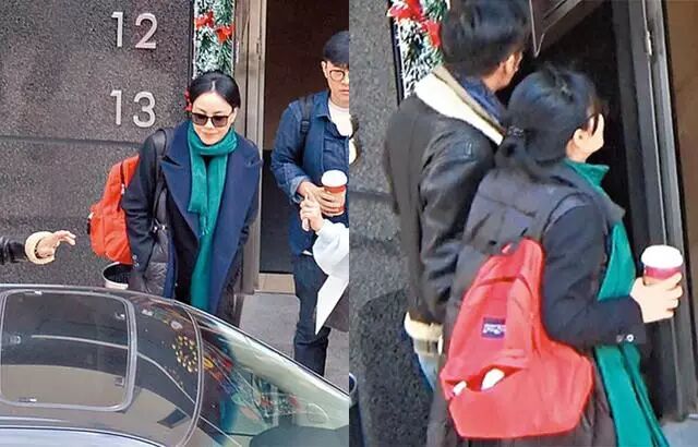 去香港幽会也是背着JANSPORT的红色背包,黑色外套绿色围巾,最难搭的红配绿也被天后hold出了时髦感!