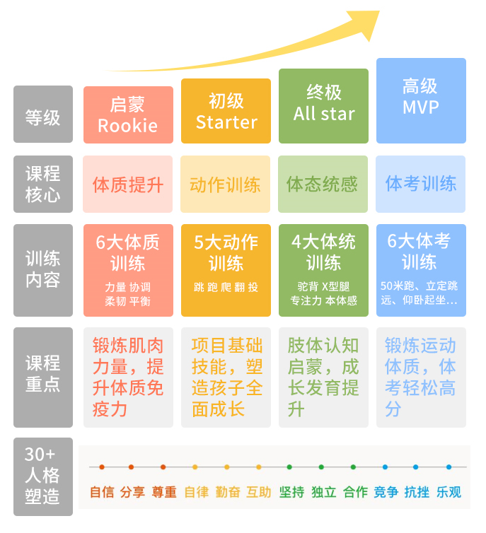 课程由美国体能协会NSCA推举,聚焦儿童六大基础运动能力,全面提升孩子身体协调力、反应力、核心力、平衡力、爆发力、柔韧性等综合身体素质。