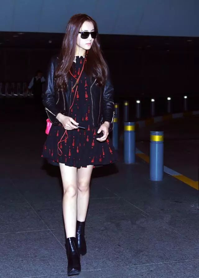迪丽热巴身穿黑色皮衣内搭短裙,秀出美腿, 搭黑色尖头短靴,帅气又时尚。