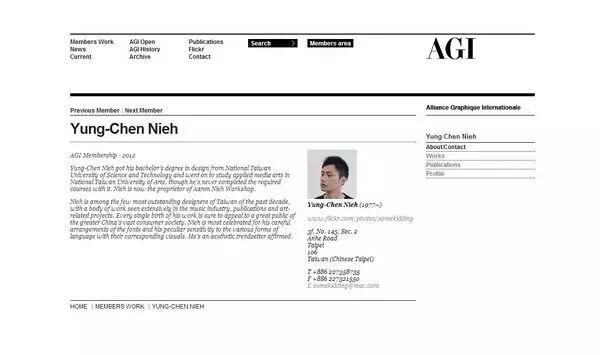 他成为35岁前进入被誉为国际平面设计界“殿堂级组织”之称的AGI(国际平面设计协会)的第一位台湾会员,进入AGI也再次证明了聂永真并不是因为做了很多明星的唱片才获得各项殊荣。