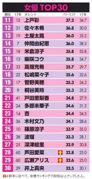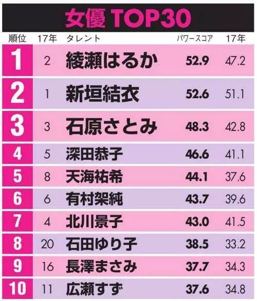 85~88年出生的,被叫做“黄金世代”的女演员占据了前三。除此以外,87年的长泽雅美也从去年的16位来到9位,88年的户田惠梨香凭借CB第三季从41位上升到21位,86年的北川景子排名第七。