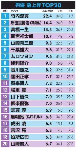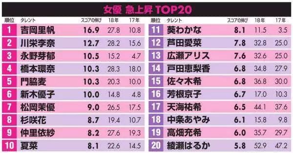 女演员榜前四位的分数都是比男演员榜首位还要高的,这四位也进入了圈地总榜的top10,证明日本娱乐圈里女演员的存在感还是逐渐提高的。