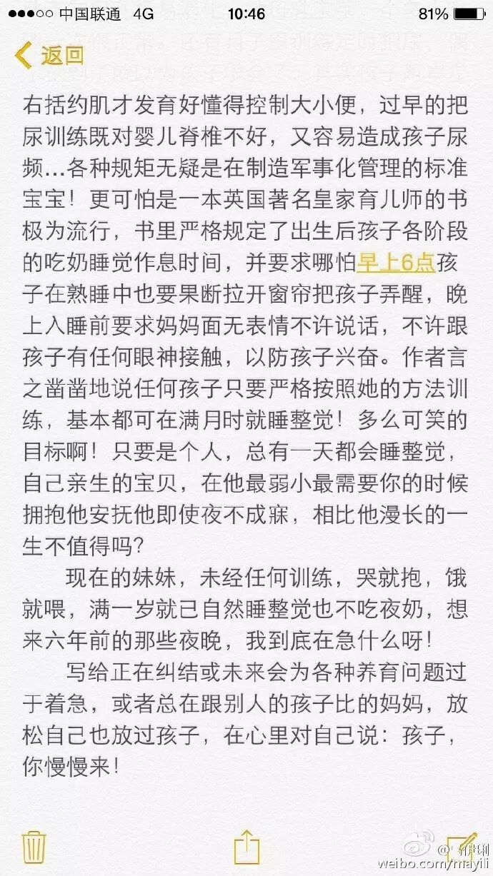 几乎成了网络上转发量最高的育儿手札,字里行间看得出她一直亲手照料两个孩子的吃喝拉撒睡。