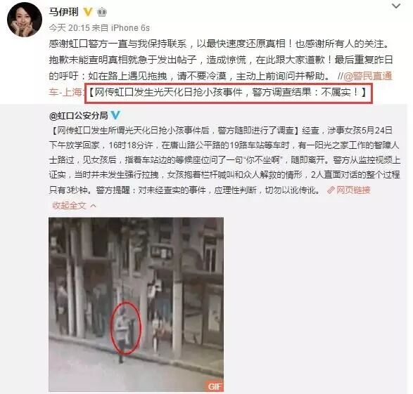 当晚,马伊琍也转发了警方的调查结果,为自己没有查明真相就急着发帖道歉,不过依然呼吁大家如果遇到拖拽孩子的状况还是要勇敢伸出援手。