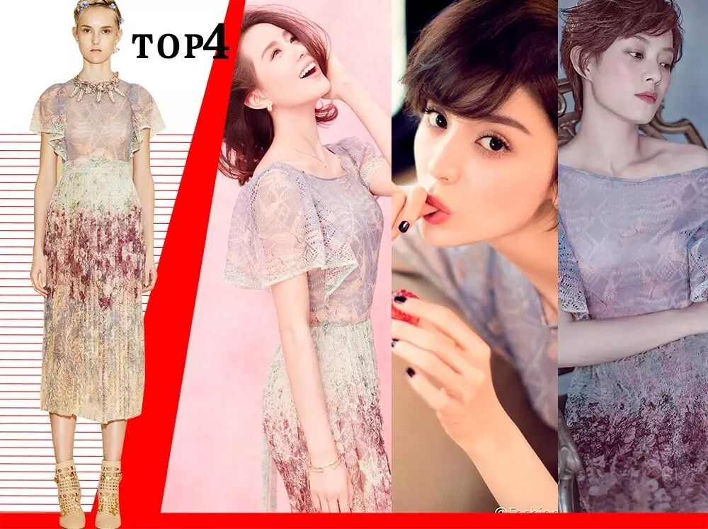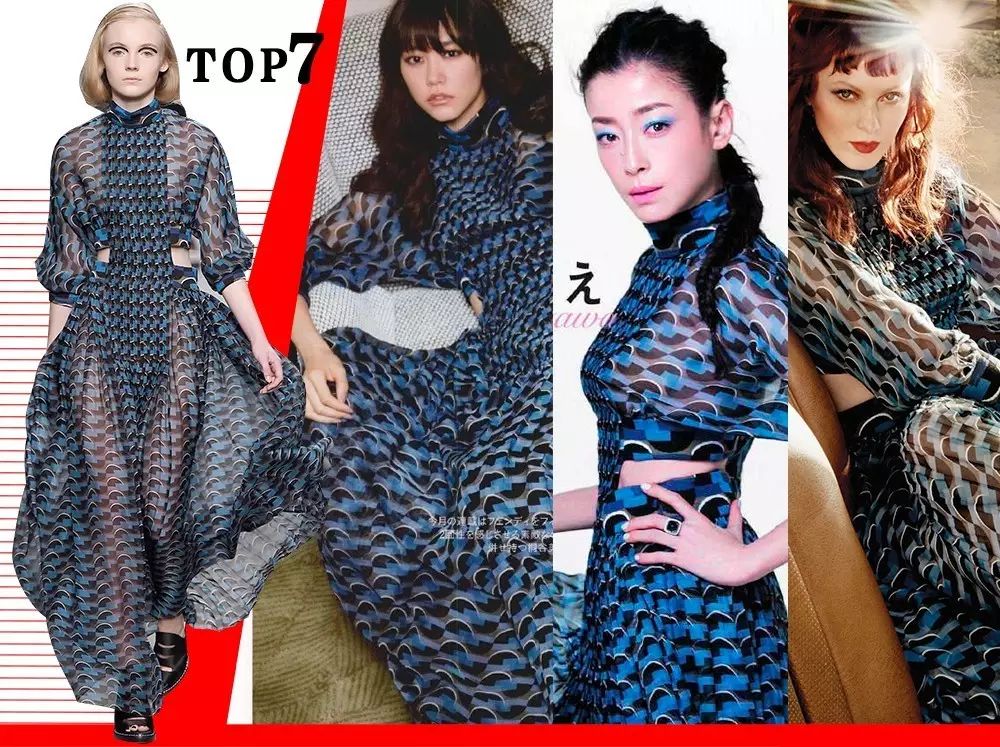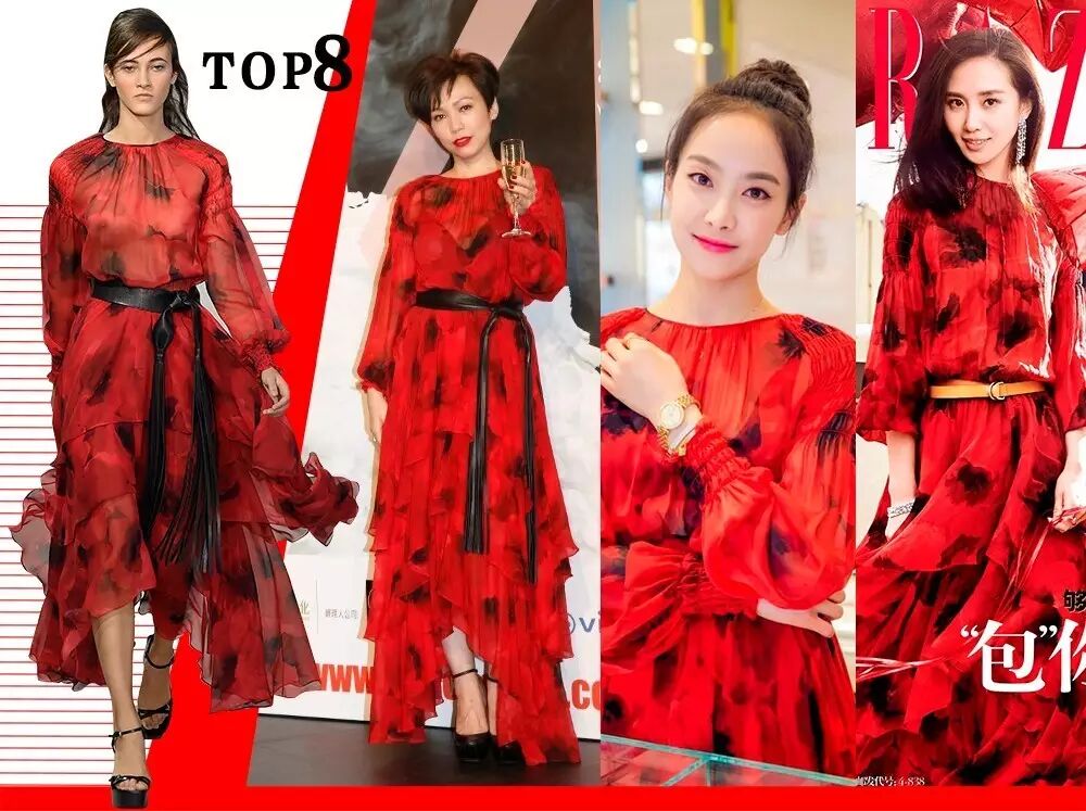 本周Prada攻占Top 1 ,Gucci依旧牢牢稳居榜中。纵观8个Top连衣裙所占的比重有百分之六,其中飘逸的薄纱面料、条纹、印花等元素都是这期爆款的要点。现在我们就来看一看哪一些单品又被明星撞了一个又一个: