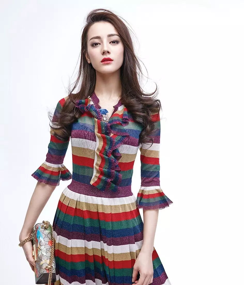 彩虹条纹具备修身的效果,百褶大摆裙尽显优雅。似复古又不仅仅是复古,柔软却不顺从,个性却不张扬,华丽却不艳俗,正是Alessandro Michele定义的Gucci女孩形象。
