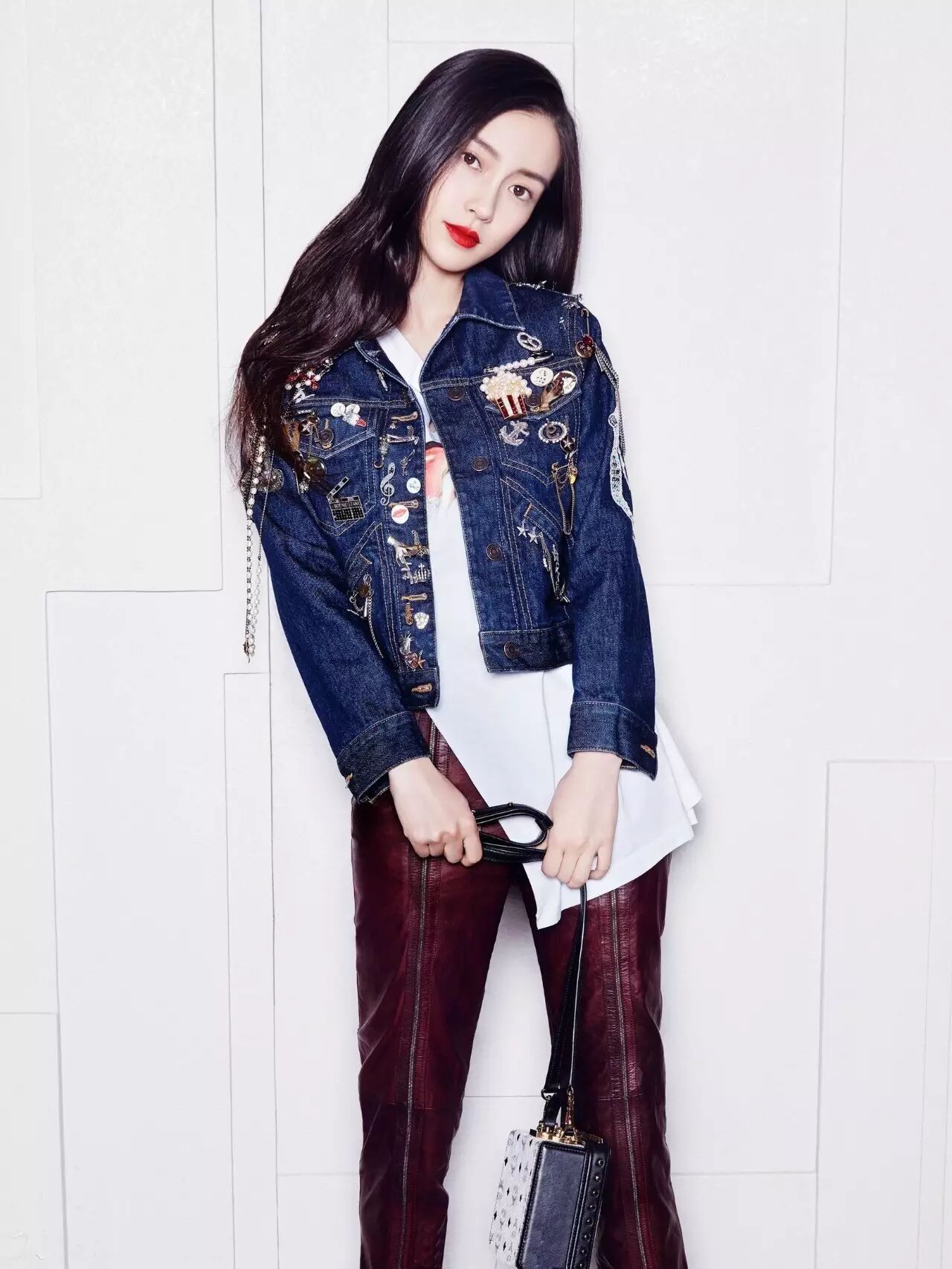 ▲Angelababy出镜《红秀Grazia》本周潮流街牌栏目,用BV酒红色皮裤+MARC JACOBS牛仔外套,搭配出不羁少女感,同样是穿皮裤就是穿得比邓紫棋好看……