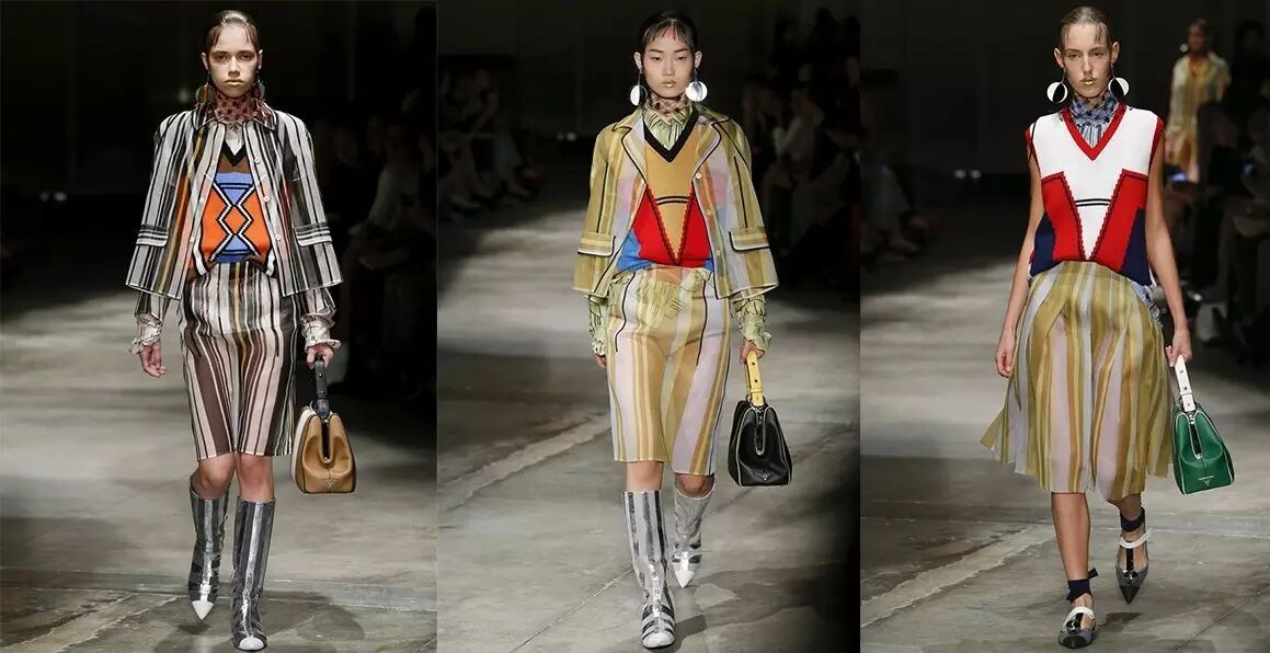 ▲Prada2016整个春夏系列都是一个关于裙套装和外套的篇章。这款精美浪漫的、以条纹元素为主的欧根纱透明裙套装让人眼前一亮。