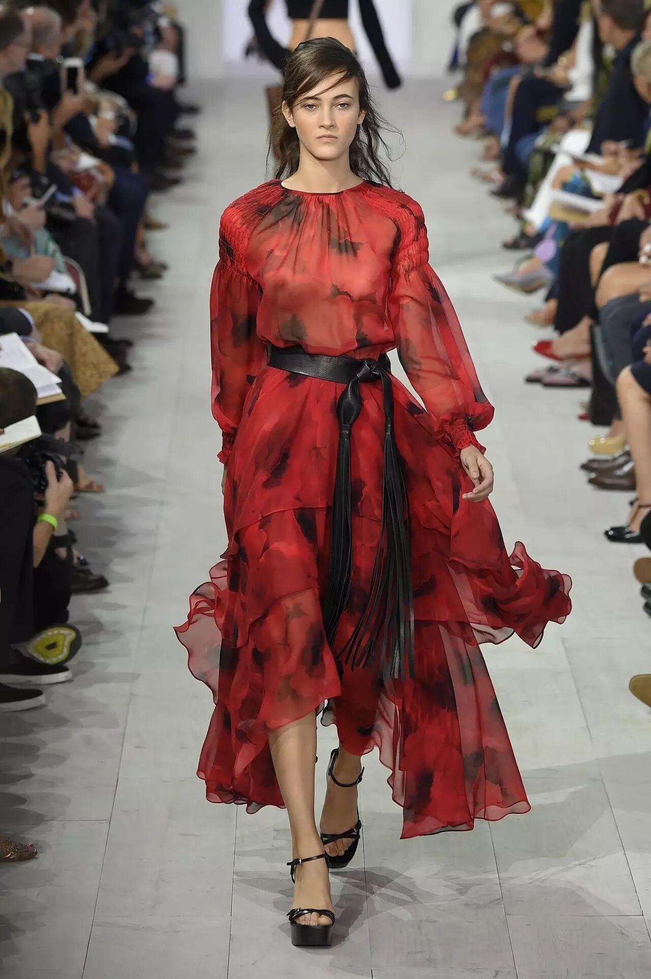 ▲这款印花雪纺,柔美飘逸的长裙,给人以满满的风情。艳丽的红色衬托肤色,潇洒的风格中增添柔美,微微透视的面料给性感加了不少分。