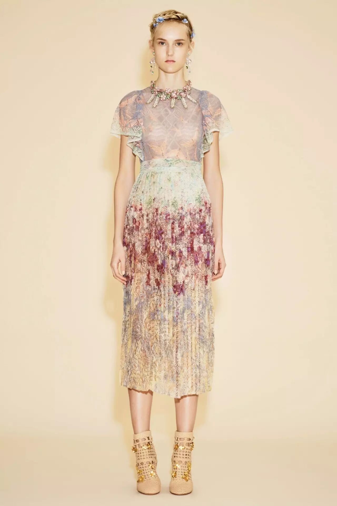 ▲Valentino这款连衣裙运用大量繁花与飞鹤元素印花,让模特变身来自原始部落的优雅仙女,每一个细节都美得令人窒息。