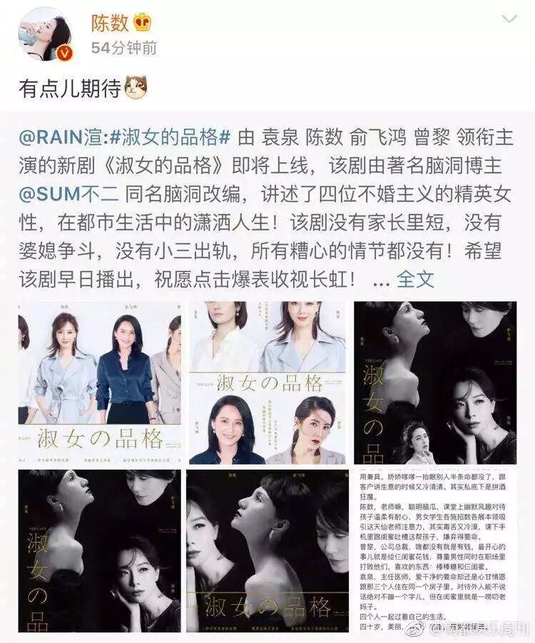其实是一位微博网友的脑洞。创意的大致内容就是拍四个都市大龄不婚主义女青年的潇洒人生,并且指定四个女演员为袁泉!陈数!俞飞鸿!和曾黎!