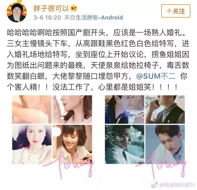 @好大一只豆沙包:瞬间脑补巨量场景。。袁泉下了手术台累到虚脱,正赶上不讲理病患大闹医院,打电话找人攒局拼酒的俞飞鸿飞快赶到,腹黑攻气场全开镇住全场。。二人坐上曾黎豪车离开,全程被毒舌冷艳流陈数吐槽:刚才换成我火力更猛。。四人在别墅天台拼酒到深夜,睡得横七竖八,醒来继续与这个世界顽强作战!