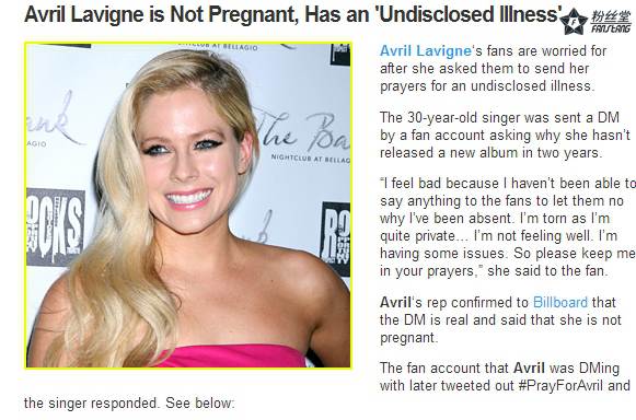 最近小黑星一直在询问Avril Lavigne怎么没有消息,有的媒体怀疑薇薇是不是怀孕了?最近薇薇透露她并没有怀孕,只是身体不适!她感谢小黑星的支持同时也祈祷希望自己赶快好起来~
