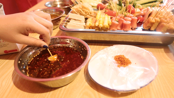 乐山油炸串串最大的特色在于带有一些甜味,尤其是肉类,牛肉、排骨、郡肝、鸡尖、掌中宝、广味香肠这些都带有一些甜味在里面。但是成都人实际上又不太喜欢吃太甜的东西,所以店家专门跑到乐山去找师傅学了手艺,回来又自己改良,最后调试了很久才确定现在这个味道。搭配上秘制的干碟子,甜而不腻,辣而不辛,酥香可口,简直完美。