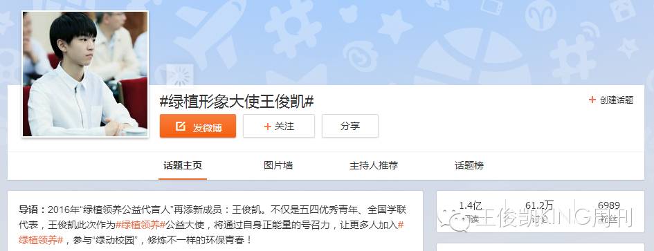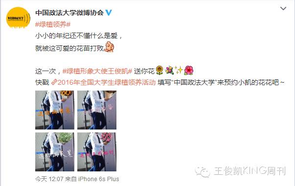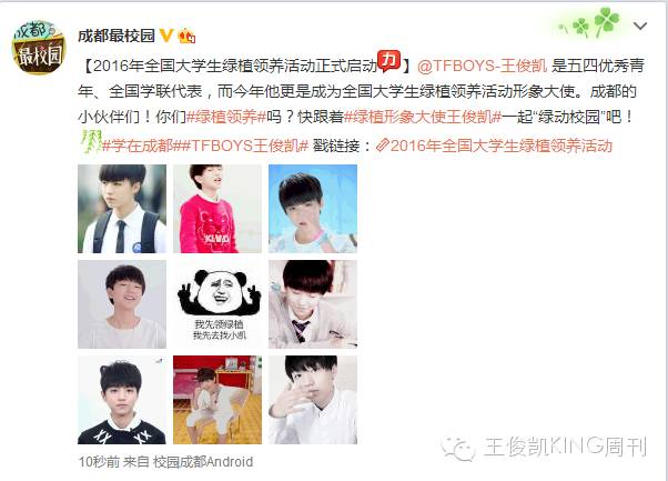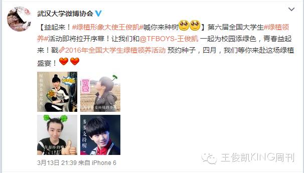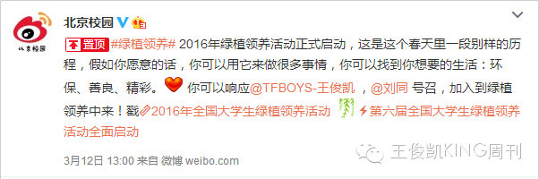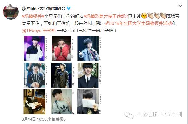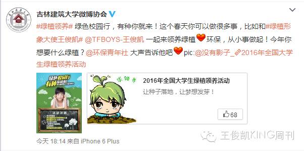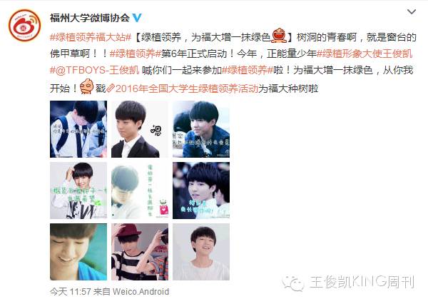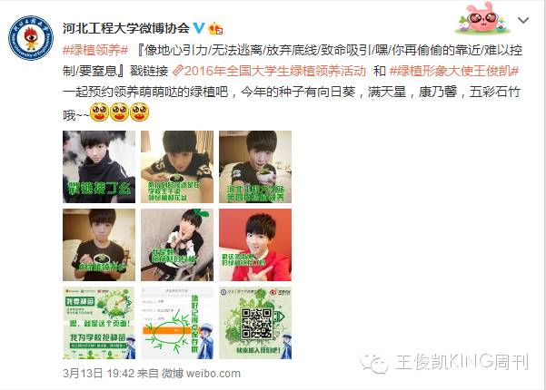 王俊凯此次担任“绿植领养”公益代言人,他正以自身正能量号召更多的人加入环保公益的队伍中,为建设绿色地球贡献出自己的力量。