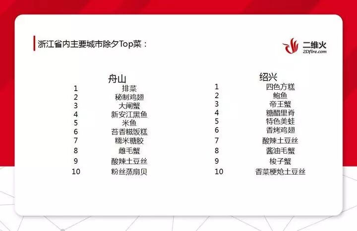 浙江省五个城市的的年夜饭各有特色。从菜品重合度上来看,杭州春卷配醋鱼,绍兴年夜爱吃蟹,宁波要吃深水虾,舟山年夜爱黑鱼,温州餐桌鱼最多。重合度较高的菜品是糖醋里脊、粉丝扇贝。五个城市的餐桌共有的一道菜是——土豆丝。