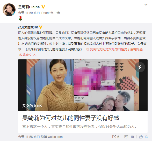 吴卓林和Andi还喜欢给吴绮莉扣歧视同性恋的帽子,为了澄清这个说法,经纪人还自曝了自己喜欢男的性取向反驳,并告诫她们不是不能出柜,而是经济独立,对社会有贡献和价值后再公开。
