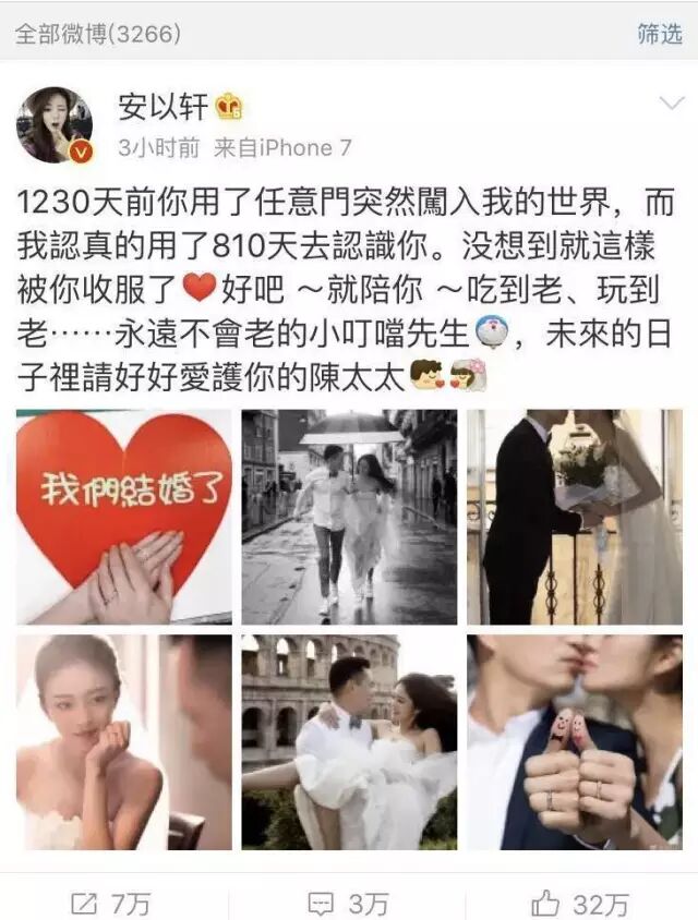 安以轩发微博称:1230天前你用了任意门突然闯入我的世界,而我认真的用了810天去认识你。没想到就这样被你收服了。好吧~就陪你~吃到老、玩到老……永远不会老的小叮当先生,未来的日子里请好好爱护你的陈太太。言语之中,尽是糖罐般甜蜜。