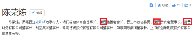 “德晋”是头衔前缀中出现最多的两个字。在被称为“亚洲拉斯维加斯”的澳门,博彩业是经济支柱,而赌场中的贵宾厅又显得尤为重要。多年前,陈荣炼就开始涉足赌场贵宾厅运营,并于2007年组织成立德晋集团。