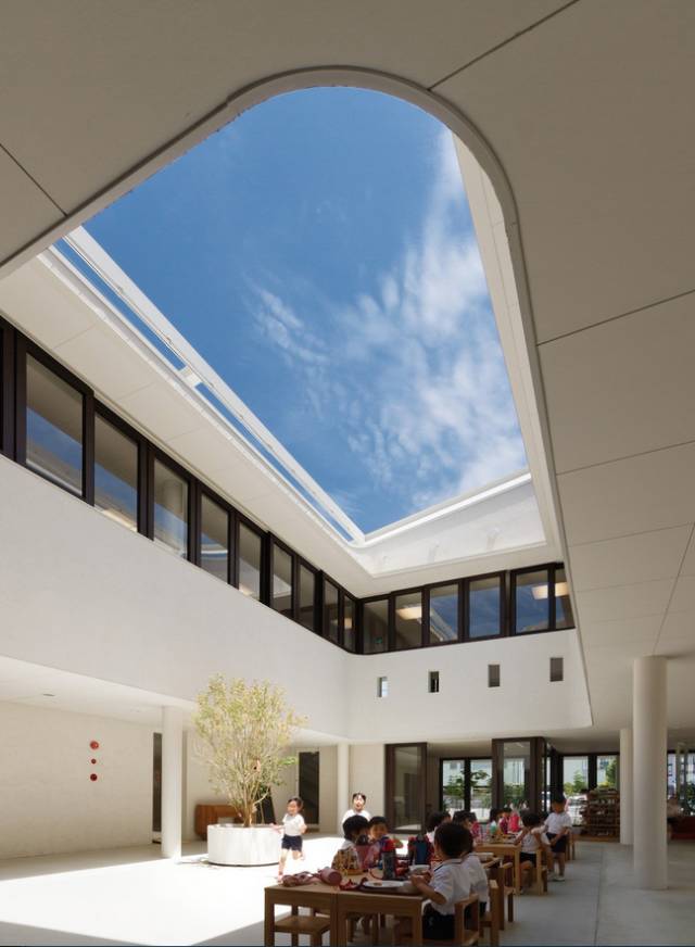 位于熊本县的daichi幼儿园之最大特色在于园内中庭的露天屋顶。在我们的印象中,孩子们总是远离风雨之外被保护得很周全,下雨天的室外活动总是不被允许的。而daichi幼稚园的中庭却特地设计成了能够积攒雨水的地面和露天屋顶,一场大雨过后,孩子们便可赤脚在看似游泳池的水塘间玩耍,释放天性。而在晴天的时候,这里化身为操场,供孩子们打羽毛球、排球等体育运动。