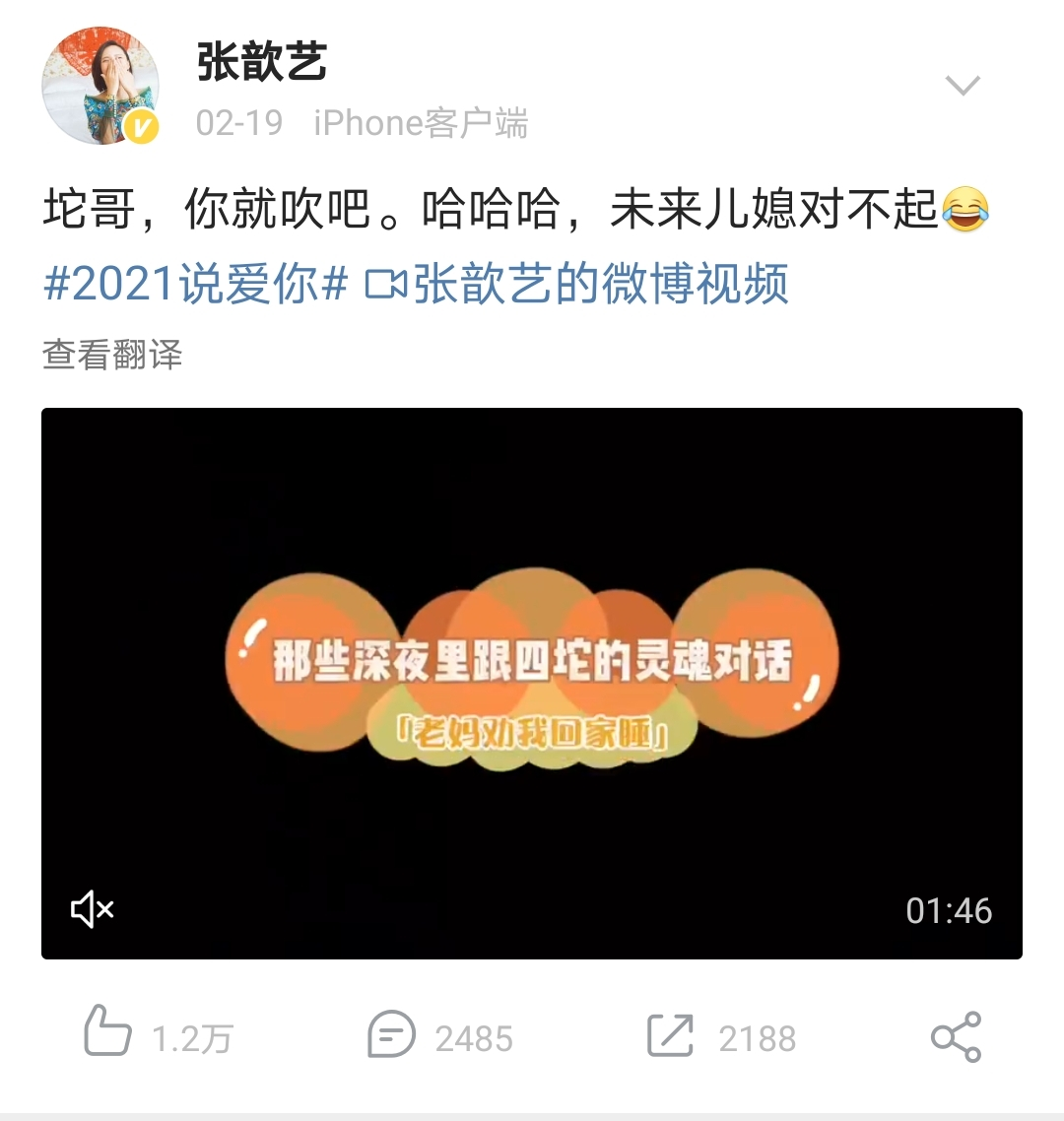 情人节那天,张歆艺晒了一段和儿子四坨的睡前对话录音。