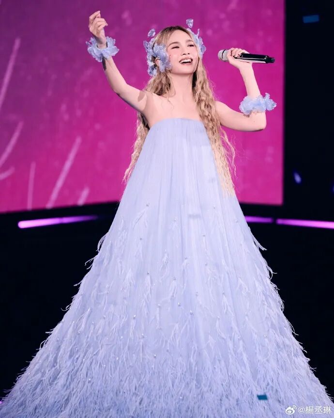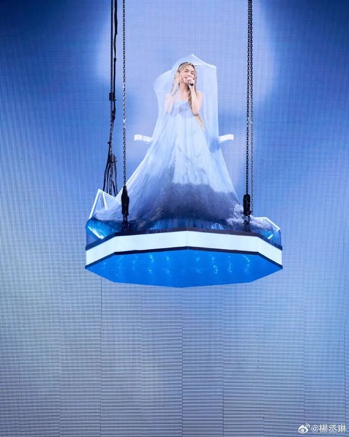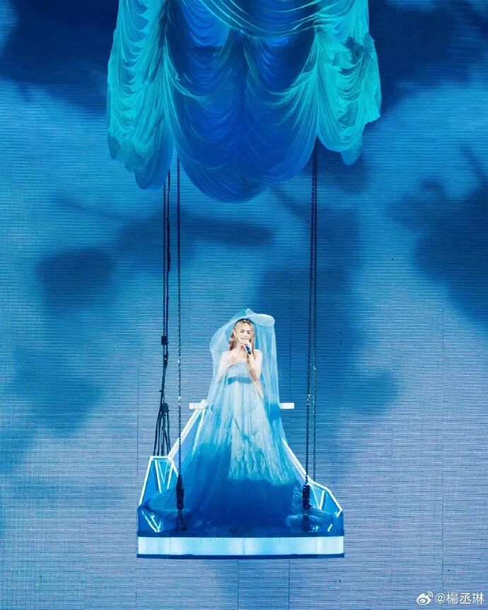 她坐在悬起的秋千上,穿的礼服是蓝白渐变的纱质,裙摆堆出软蓬的弧度,像把浅淡的星空揉进了裙身。上一轮巡演的舞台装偏利落短款,这次选了秋千这种柔缓的装置,连礼服的纱都软得能接住舞台光。她说这场是 “巨大的考验”,可坐在秋千上的她,连裙摆的褶皱都跟着光软下来,一点没有 “考验” 的紧绷,只有舞台里的松弛。
