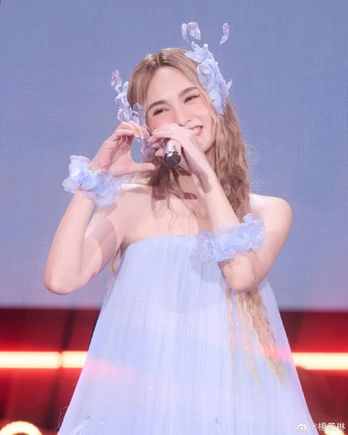 她对着镜头比心,礼服的袖口垂着细纱飘带,发丝里别着闪片装饰,连眼神都跟着软下来。她的演唱会总爱用互动裹紧情绪,这次的比心不是预设的舞台动作,更像唱到动情处的本能反应,连飘带的晃动都跟着心跳节奏,是把观众的欢呼,都揉成了手里的甜。