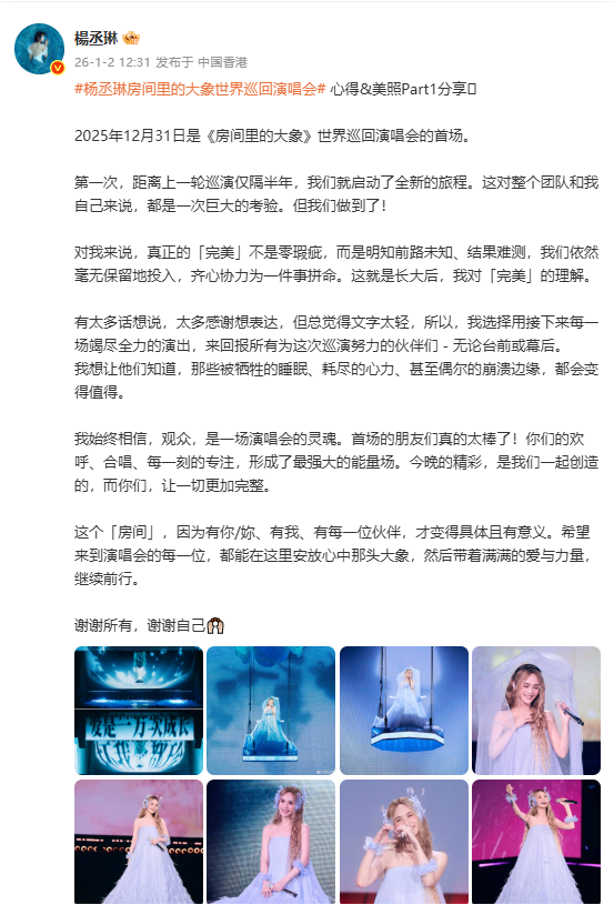 杨丞琳从《流星花园》里灵动的小优起步,唱《暧昧》《雨爱》时把细腻情绪揉进旋律里,办演唱会更爱用舞台设计裹紧情感共鸣。2026 年 1 月 2 日她在香港发的这条动态,是《房间里的大象》巡演首场落幕的复盘。文案里说 “完美不是零瑕疵”,舞台上的秋千、渐变纱裙,刚好把她对 “用力却温柔” 的理解,都铺在了每场光里。