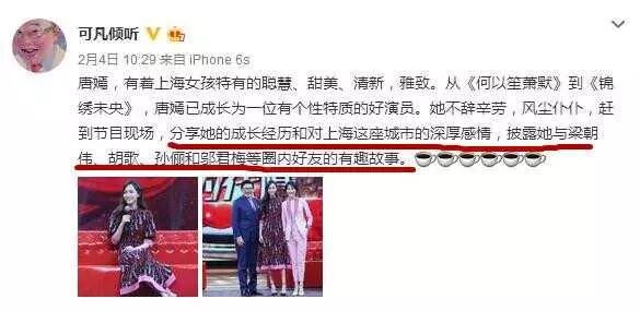 前天唐嫣参加了访谈节目可凡倾听,在这次访谈节目中,唐嫣爆了不少她和朋友们之间的秘辛,但是有趣的是却是主持人曹可凡的这几句话。