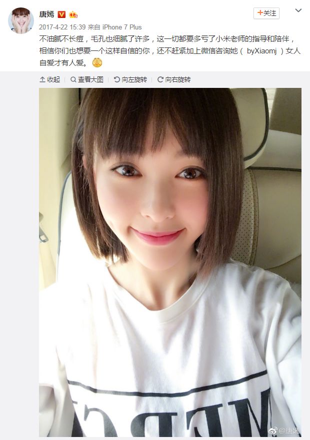 不得不说唐嫣的颜值真的是非常高,白皙水嫩的皮肤,不油腻也不长痘,就像下面图片说的一样。