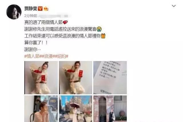 贾静雯微博上说一早上就接到了修杰楷的电话,而工作结束后更是收到修杰楷送来的情人节礼物和卡片告白,感觉自己就像过了两个情人节,很是开心了。