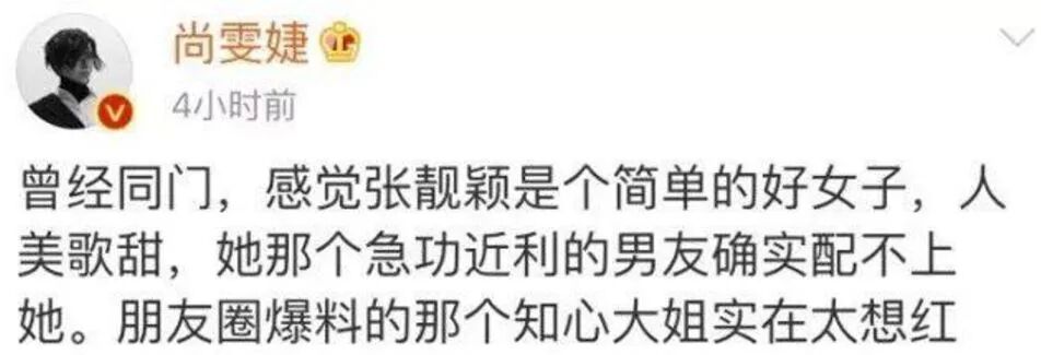 就在大家处在猜测中没有实锤的时候,张靓颖昔日同门尚雯婕一条微博似乎将这件事坐实。