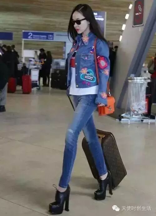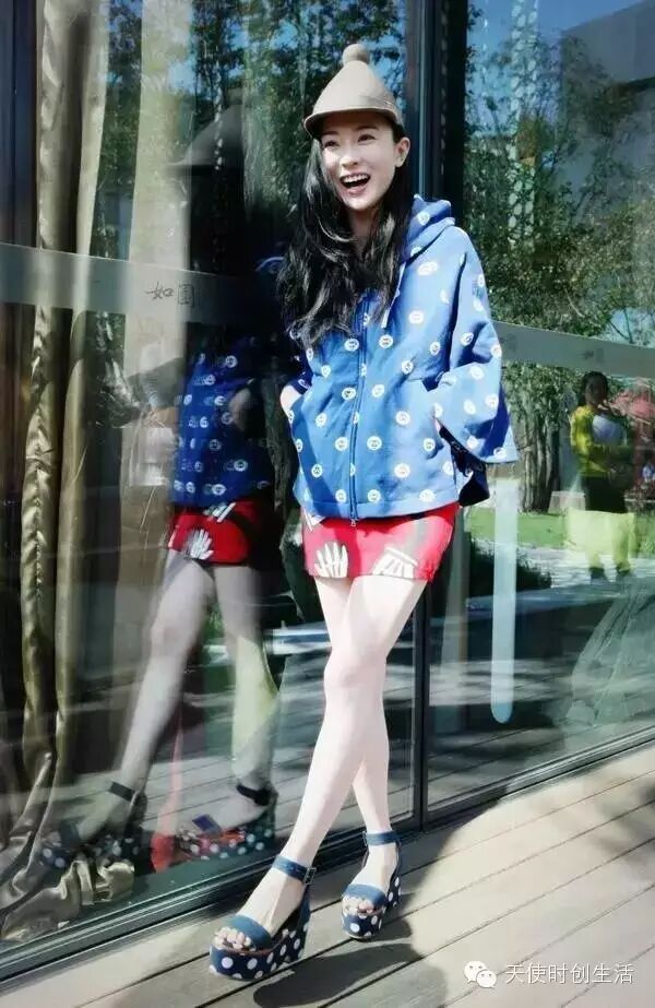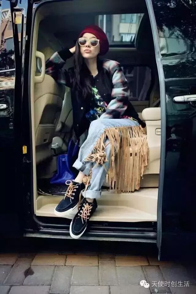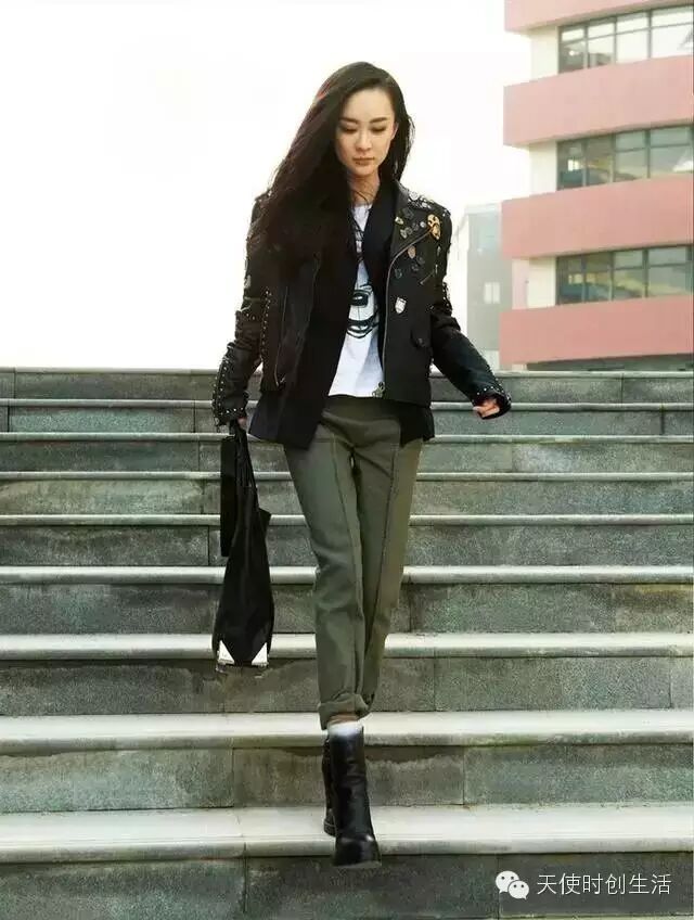 带有嬉皮味的皮衣,特别之处在于翻领与袖口部分的徽章和铆钉装饰。霍思燕将这件皮衣驾驭的很有自己的味道~