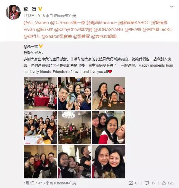 而蔡一智在微博发文一一感谢好友:感谢大家出席我的生日宴会,非常珍惜大家的友誼及我們所擁有的,就讓我們也一起令別人快樂,你們送給我的大利是我都會捐出去"兒童癌病基金會",一起送暖。Happy moments from our lovely friends. Friendship forever and love you all❤️