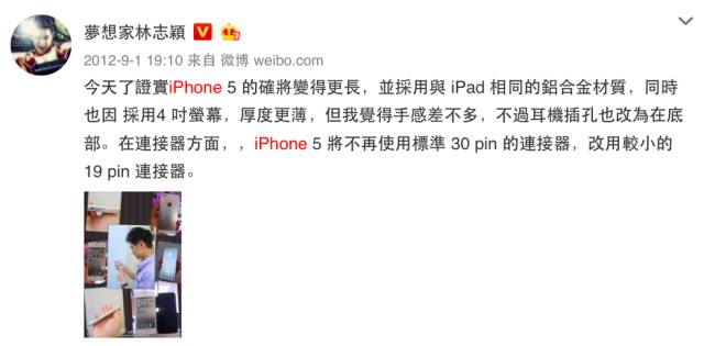 2012年9月,距离iPhone5发布会还有十二天的时候,他秀出了iPhone5的物图和评测。