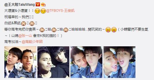 王俊凯看到王大陆发布的合照之后,也来凑热闹说:“你可以把我的脸变黑,可是你不能把我的脸变大”