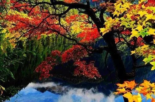 “秋叶与雪峰相拥,碧水共长天一色”。