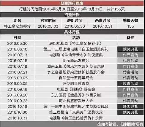 其实《楚乔传》开播不久就有很多网友指出赵丽颖很多地方都用了替身,但是粉丝们做出了赵丽颖拍摄期间的行程图,证明她几乎都在剧组。